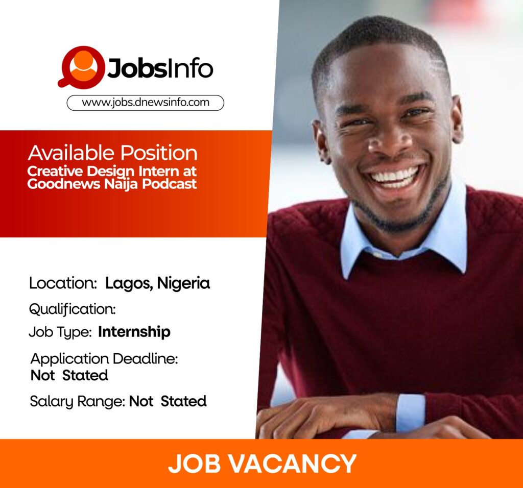 Goodnews Naija Podcast is seeking a Creative Design Intern to support its digital content and media production team. The role involves creating visual assets and assisting with multimedia content for social media platforms and digital campaigns.