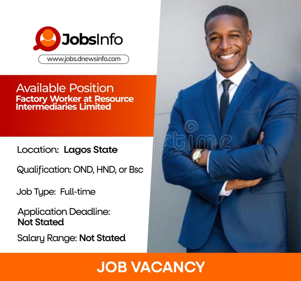 Resource Intermediaries Limited is recruiting suitable candidates to fill the position of Factory Worker in Lagos. This role is open to candidates with varying educational backgrounds who are willing to work in a factory environment