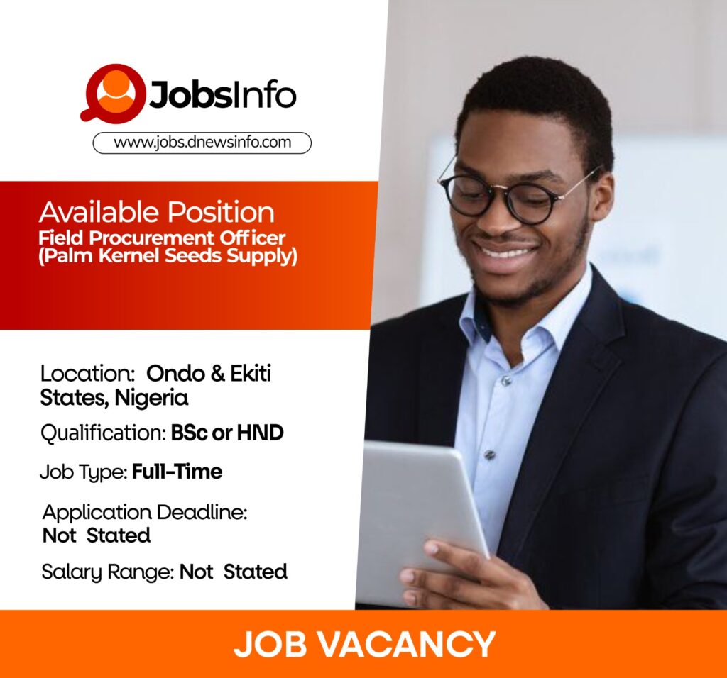 The company is seeking a results-driven Field Procurement Officer to oversee the sourcing and purchase of palm kernel seeds across Ondo and Ekiti States. This role requires frequent field engagement, supplier relationship management, and quality assessment of agricultural produce.