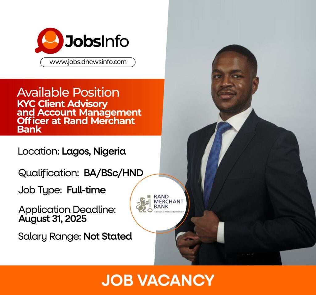 Rand Merchant Bank is seeking a KYC Client Advisory and Account Management Officer to join its Lagos office. The role involves managing the end-to-end client onboarding process while ensuring compliance with regulatory standards. The ideal candidate will enhance client experiences, drive relationship management, and maintain accurate account information.