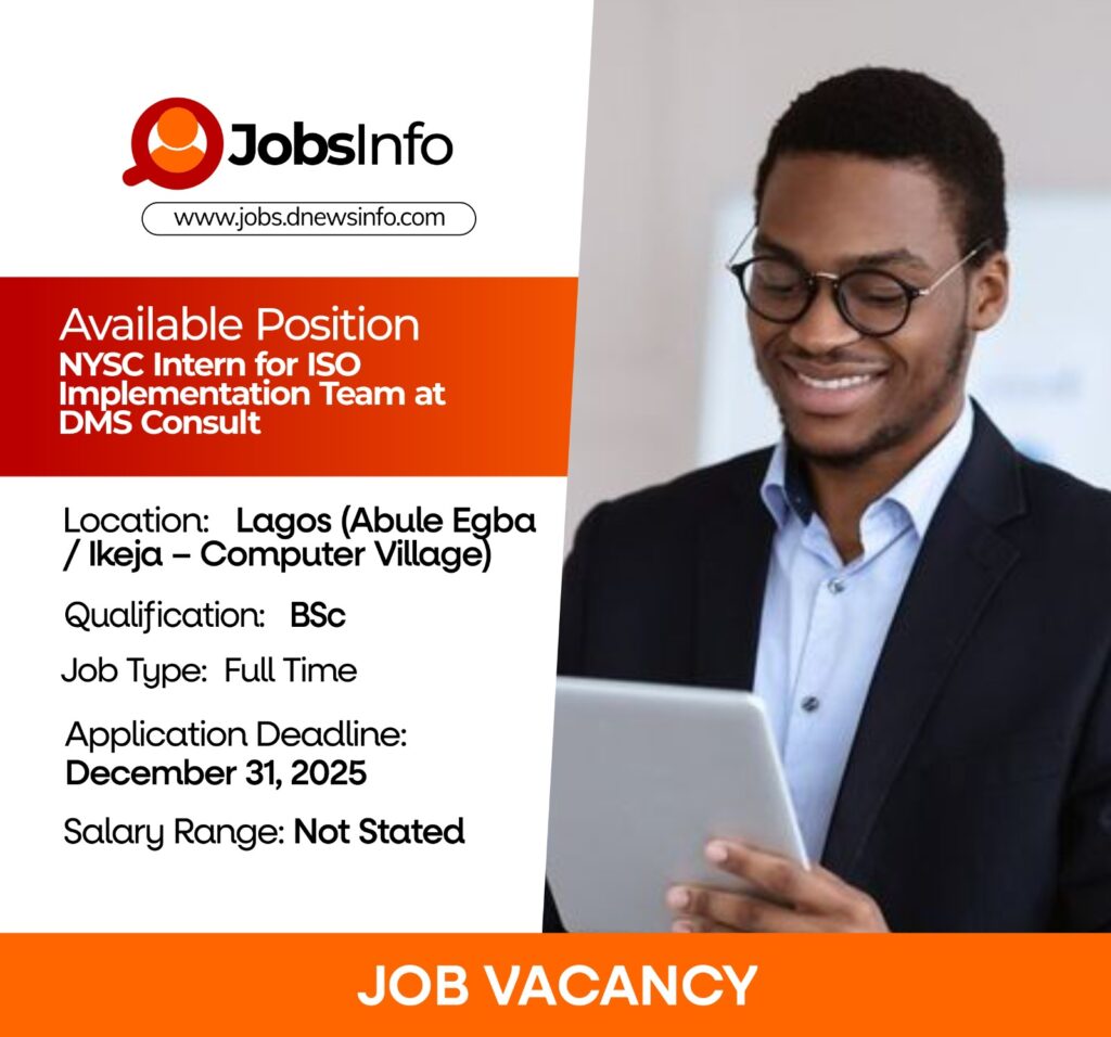 DMS Consult is seeking NYSC Corps Members with interest in basic networking or foundational coding to join its ISO 27001 & ISO 45001 implementation team.