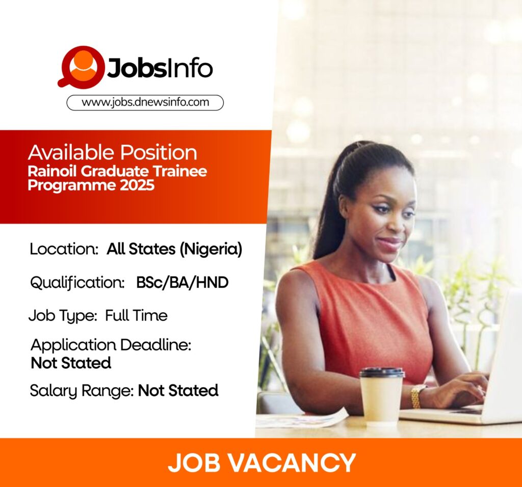 Rainoil is inviting applications from young, ambitious Nigerian graduates for its 2025/2026 Graduate Trainee Programme. This initiative is designed to groom high-performing individuals into future business leaders through structured learning, hands-on experience, and exposure to real-world challenges in a dynamic and innovative environment.