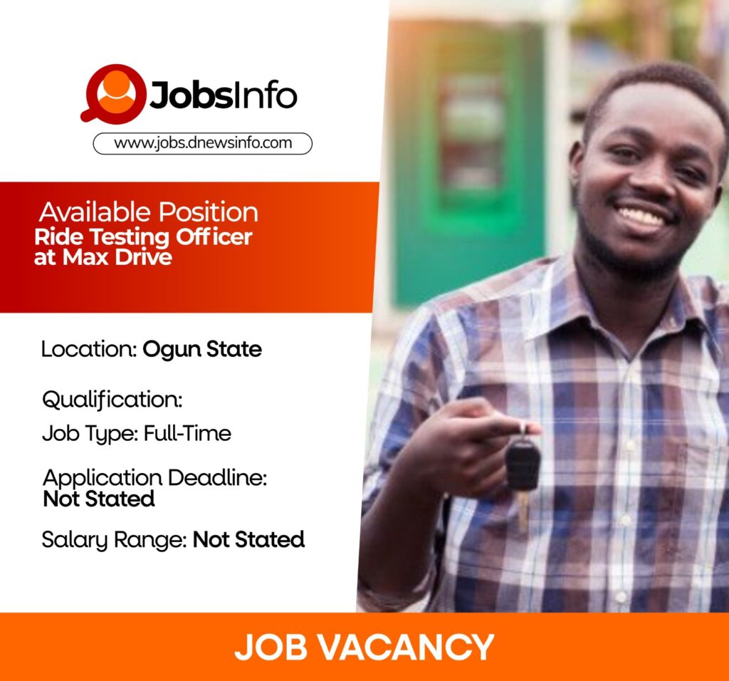 Max Drive is seeking a Ride Testing Officer to join its operations team in Sango Ota. The successful candidate will be responsible for conducting performance and safety tests on motorcycles and tricycles, ensuring compliance with road regulations, and evaluating drivers’ competencies before deployment.
