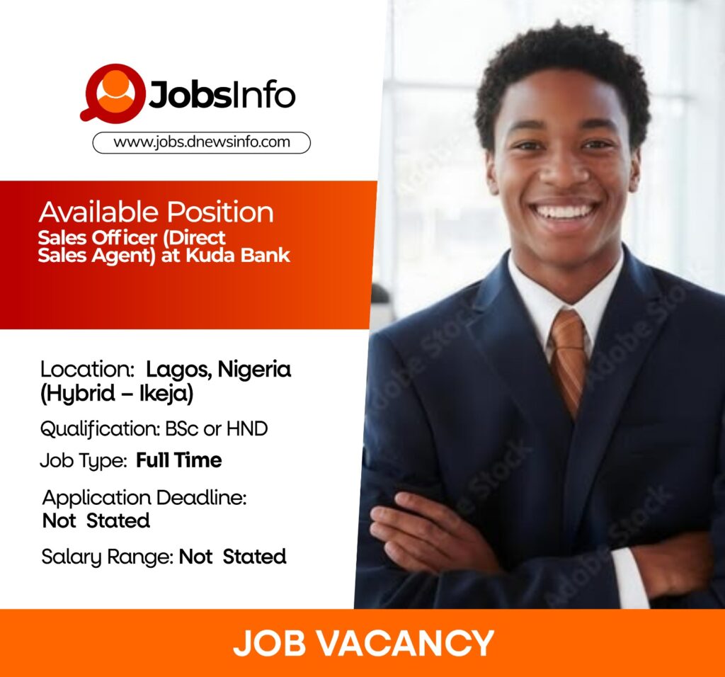 Kuda Bank is seeking a Sales Officer (Direct Sales Agent) to support its customer acquisition and business growth initiatives. The successful candidate will be responsible for identifying potential customers, promoting the bank’s digital financial products, and building strong client relationships.