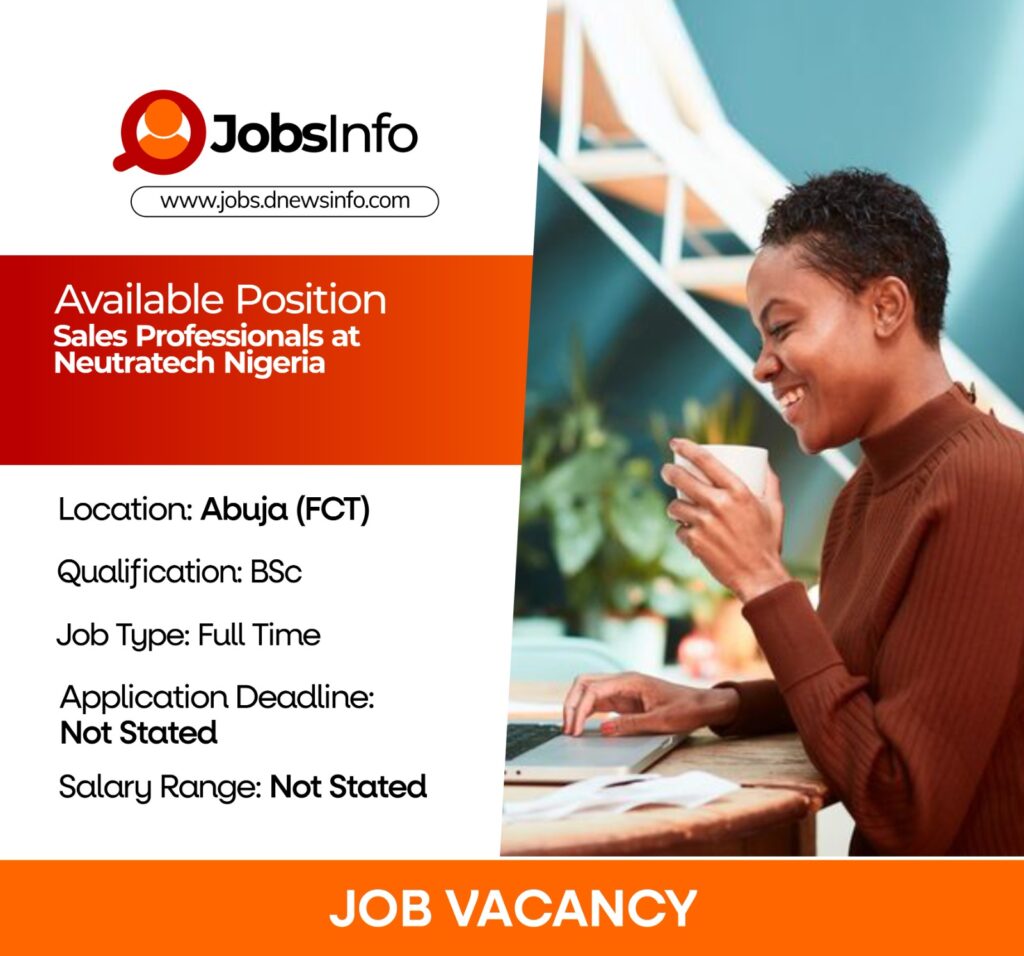 Neutratech Nigeria is currently recruiting Sales Professionals to join its growing Abuja team. The successful candidates will be responsible for driving sales performance, engaging clients professionally, and working collaboratively to meet and exceed business targets.