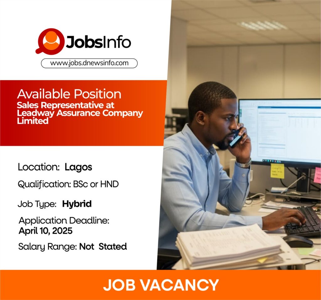 Leadway Assurance Company Limited is currently recruiting qualified candidates for the role of Sales Representative to support its growing sales operations.